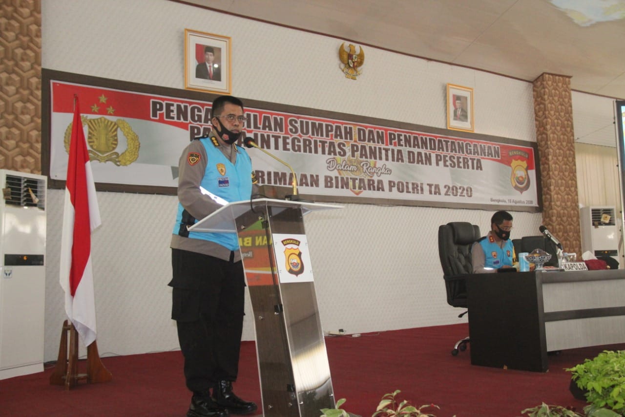 Karo SDM Polda Bengkulu Kombes Pol. Ivan Adityas Nugraha S.IK menjelaskan pada acara Pengambilan Sumpah dan Penandatanganan Pakta Integritas Panitia Dan Peserta Dalam Rangka Penerimaan Bintara Polri T.A. 2020 di gedung Adem Polda Bengkulu, Rabu pagi (19/08/2020) menjelaskan penerimaan bintara polri tahun 2020 ini dibagi dua kategori yakni Calon Bintara Polri Polisi Tugas Umum (PTU) dan Calon bintara kompetensi khusus (Bakomsus).