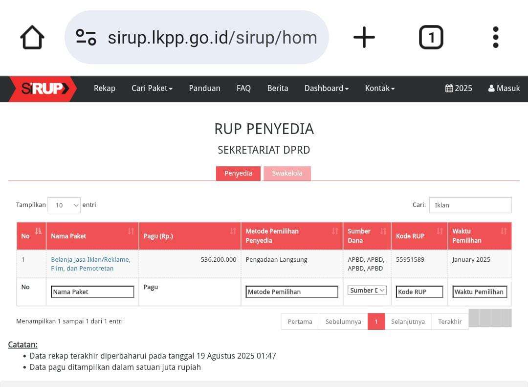 Dalam dokumen yang tercantum pada Sistem Informasi Rencana Umum Pengadaan (SIRUP), belanja publikasi tersebut mencakup paket iklan di televisi, media online, hingga media cetak lokal dengan masa pelaksanaan mulai Januari hingga Oktober 2025.