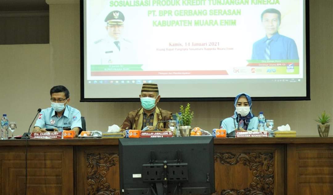 Wartainspirasi.com, MUARA ENIM – Bupati Muara Enim H Juarsah diwakili Asisten II Bidang Perekonomian dan Pembangunan Amrullah Jamaludin membuka kegiatan Sosialisasi Produk Kredit Tunjangan Kinerja (Tukin) PT Bank Perkreditan Rakyat (BPR) Gerbang Serasan / Perusahaan Perseroan Daerah (Perseroda) Kabupaten Muara Enim tahun 2021, Kamis (14/01) di Ruang Rapat Pangripta Nusantara, Bappeda.