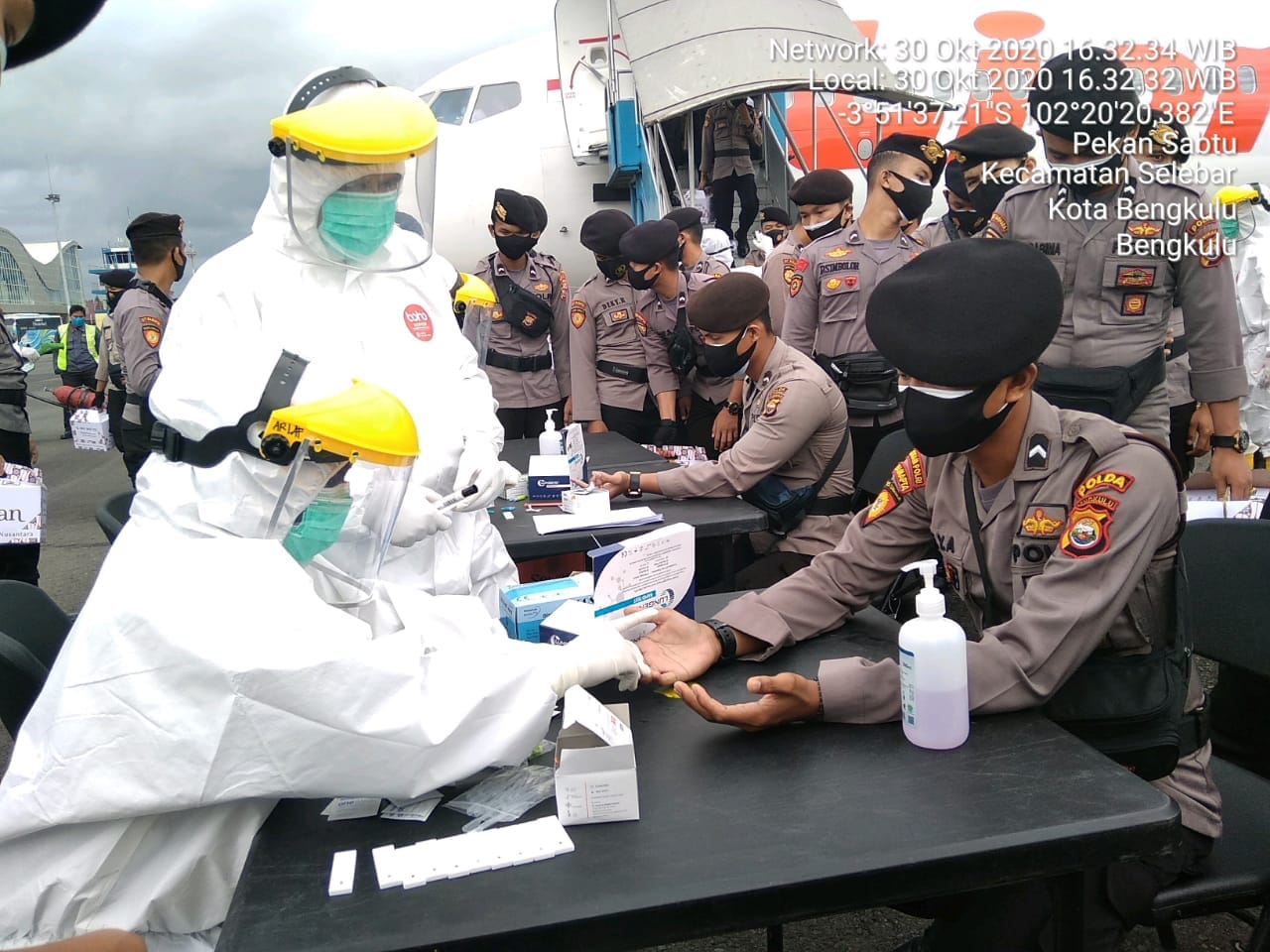 Tes yang dilaksanakan bekerja sama dengan Kantor Kesehatan Pelabuhan Kementerian Kesehatan Indonesia bertempat di Bandara Fatmawati Soekarno adalah berupa rapid tes bagi 98 personel tersebut, bila didapatkan hasil reaktif akan langsung dilakukan penanganan di RS Bhayangkara Bengkulu.
