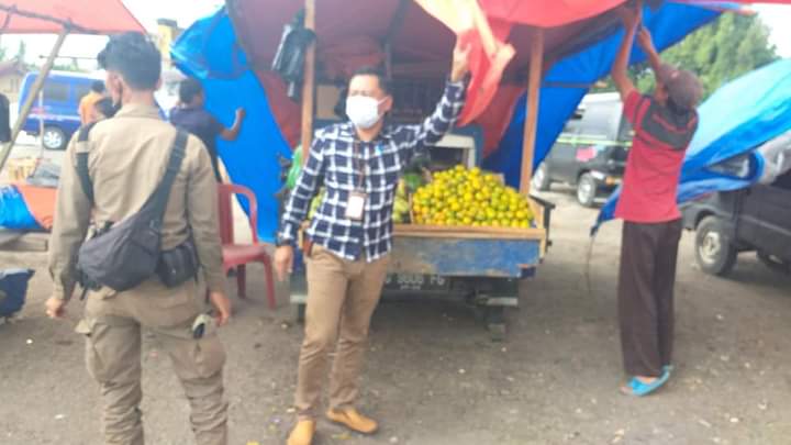 Camat Lawang Kidul Andrille Martin SE beri penjelasan terhadap kembali munculnya para pedagang lapak liar buah di pasar Bantingan Tanjung Enim, Kecamatan Laki, Kabupaten Muara Enim. Selasa, (26/1/2021).