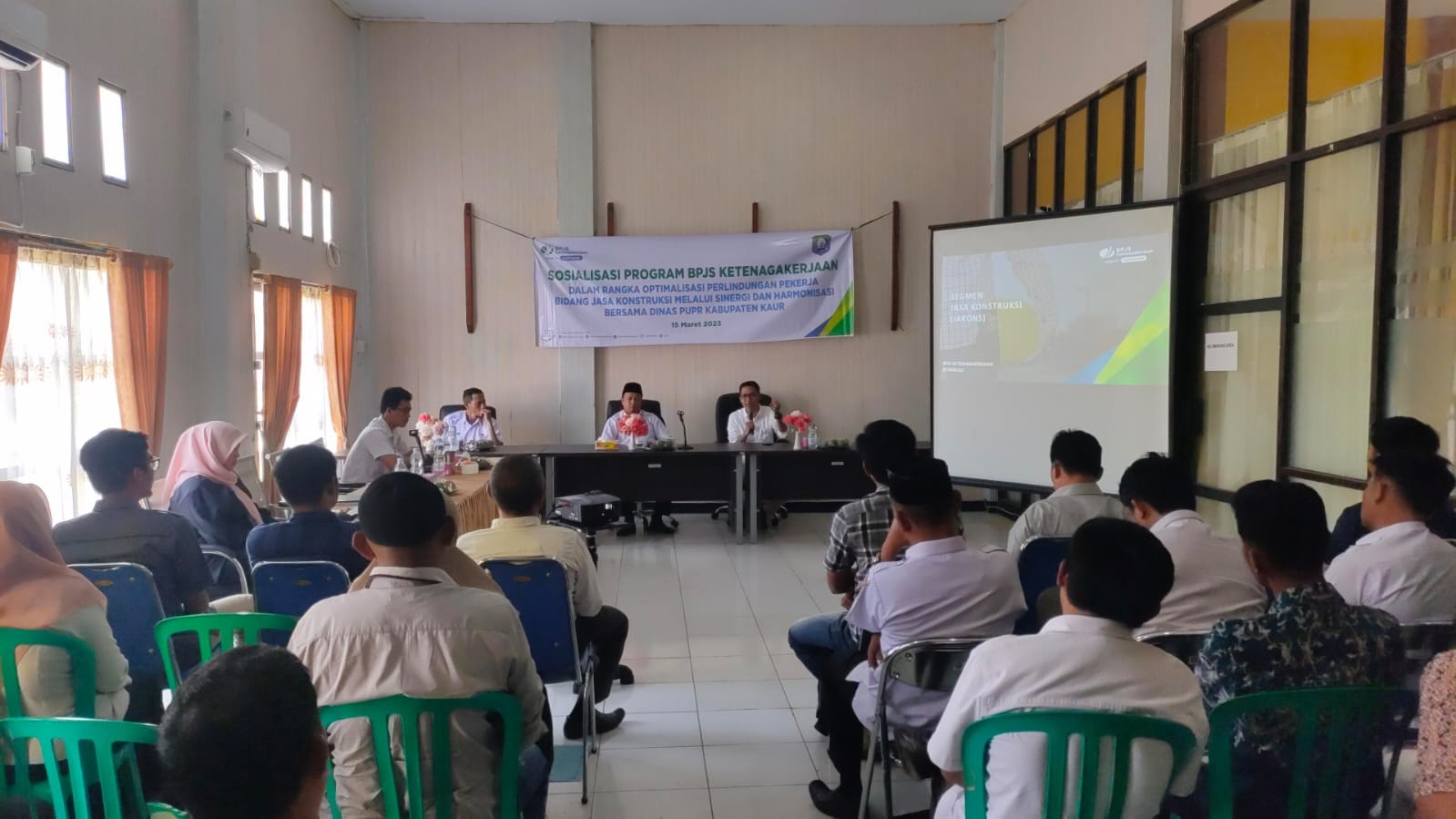 Dinas Pekerjaan Umum dan Penataan Ruang (PUPR) Kaur yang bekerjasama dengan Badan Penyelenggara Jaminan Sosial (BPJS) Ketenagakerjaan melaksanakan sosialisasi Program BPJS Pekerjaan kepada Kontraktor jasa kontruksi diruang pertemuan DPUPR, dengan narasumber Kepala Bidang Kepesertaan BPJS Ketenagakerjaan Bengkulu, Aidil Fitriansyah, Rabu (15/03/23).