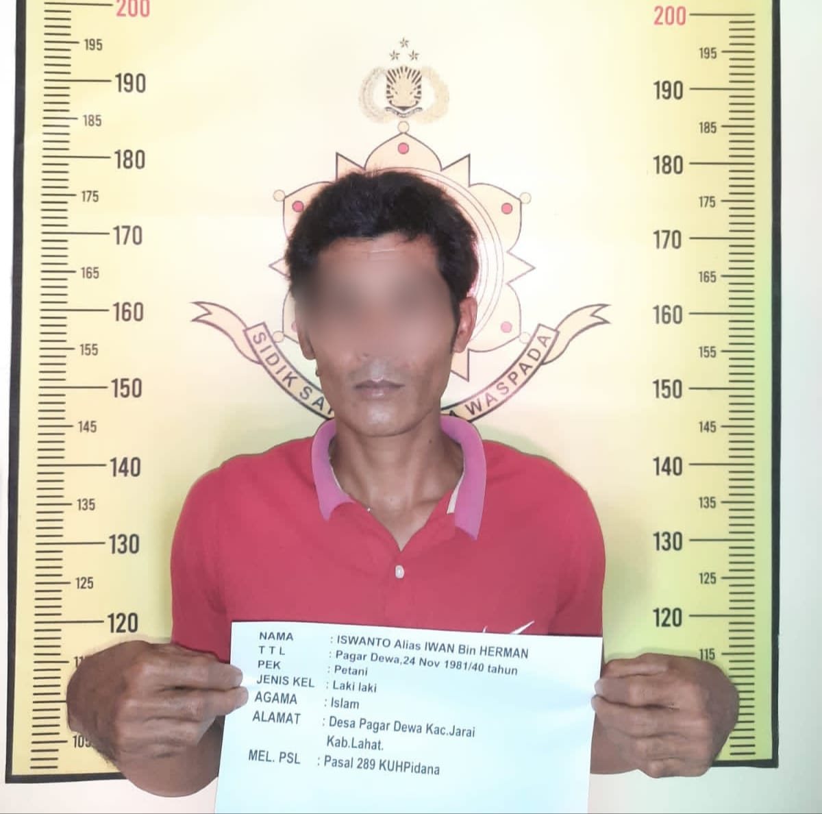 “Kini tersangka Iswanto mendekam dijeruji penjara setelah berhasil dibekuk jajaran reskrim Polsek Jarai, Lahat,” ujar Lispono, Sabtu (4/6/2022).