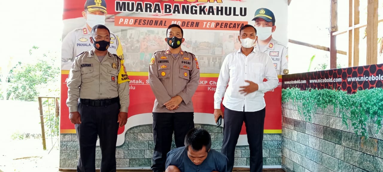 Dalam kegiatan Konferensi Pers bersama awak media kemarin Senin (26/10), Kapolsek Muara Bangkahulu AKP Chusnul Qomar, SH, S.IK, MM., didampingi Panit 1 Reskrim IPDA Nur Huda, SH, dan Anggota BRIPKA Yainudin, menerangkan, terduga pelaku ES (33) Tuna Karya asal Kecamatan Gunung Sugih Kabupaten Lampung Tengah berhasil diamankan setelah pihaknya berkoordinasi dengan Jajaran Polsek Gunung Sugih Polda Lampung.