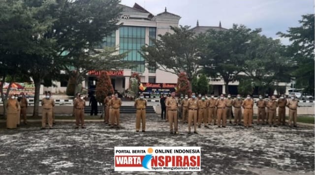 WARTAINSPIRASI.COM, OKU TIMUR — Hari pertama ngantor di Pemkab OKU Timur, H Lanosin ST dan H. M Adi Nugraha Purna Yudha SH langsung memimpin apel pagi bersama pegawai Pemkab OKU Timur khususnya Eselon II,III dan IV, Senin (01/03/21).