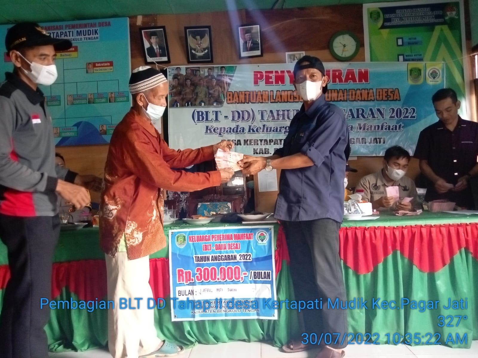 Bengkulu Tengah – Pemerintah Desa Kertapati Mudik Kecamatan Pagar Jati Kabupaten Bengkulu Tengah kembali menyalurkan Bantuan Langsung Tunai Dana Desa (BLT-DD) tahun 2022 untuk Triwulan Kedua (April, Mei, Juni 2022) kepada 111 Keluarga Penerima Manfaat (KPM). Kegiatan ini dilaksanakan pada Sabtu, 30 Juli 2022 sekitar pukul 10.15 Wib bertempat di Kantor Desa Kertapati Mudik dengan tetap menerapkan protokol kesehatan.