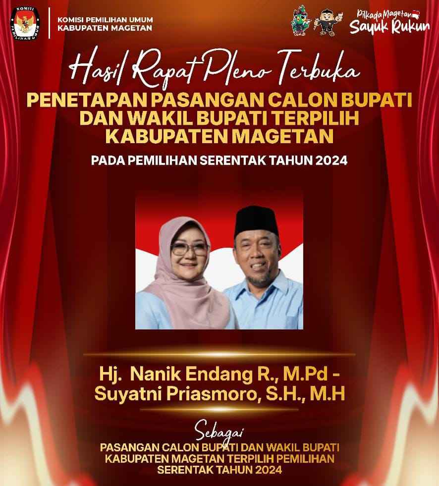 Hal ini berdasarkan dengan Surat Keputusan KPU Magetan Nomor 21 Tahun 2025 tentang Penetapan Pasangan Calon Bupati dan Wakil Bupati terpilih Kabupaten Magetan tahun 2024.