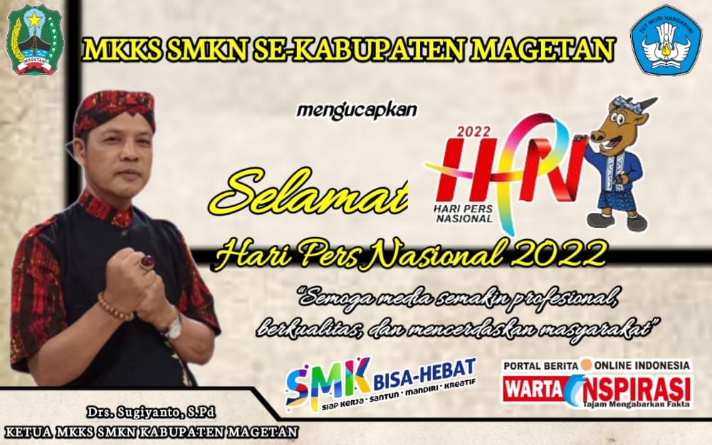 Sebagai Wujud Partisipasi dalam memperingati Hari Pers Nasional (HPN) Tahun 2022 yang selalu diperingati pada tanggal 9 Februari, Ketua MKKS SMKN se-Kabupaten Magetan, Drs. Sugiyanto, S.Pd, mengucapkan selamat memperingati Hari Pers Nasional (HPN) Tahun 2022.