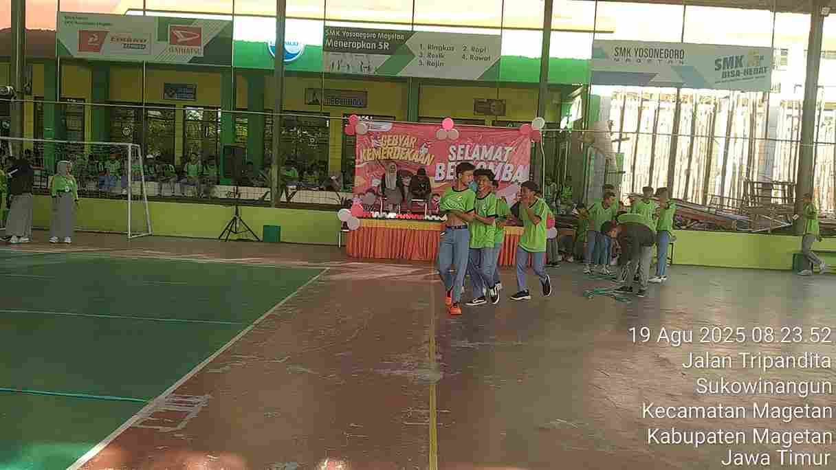 Kegiatan ini berlangsung meriah dengan penuh semangat kebersamaan dan nasionalisme, berlangsung di Lapangan Futsal SMK Yosonegoro Magetan, pada Selasa (19/08/2025).