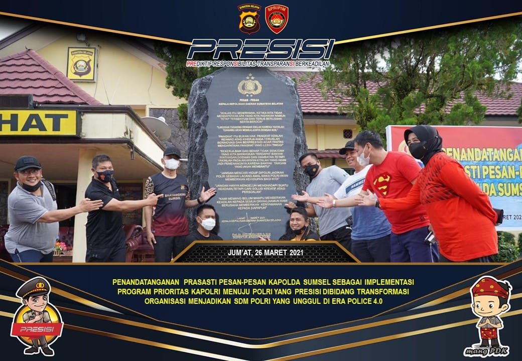 Dalam arahannya Kapolda Sumsel Irjen Pol Prof Dr Eko Indra Heri S MM mengatakan, penandatanganan prasasti ini sebagai bahan untuk memotivasikan diri dan menghindari pelanggaran, serta senantiasa mengedepankan integritas dalam melaksanakan tugas, sebagai wujud Implementasi Program Prioritas Kapolri menuju Polri yang Presisi di bidang Transformasi Organisasi menjadikan SDM Polri yang unggul di Era Police 4.0.