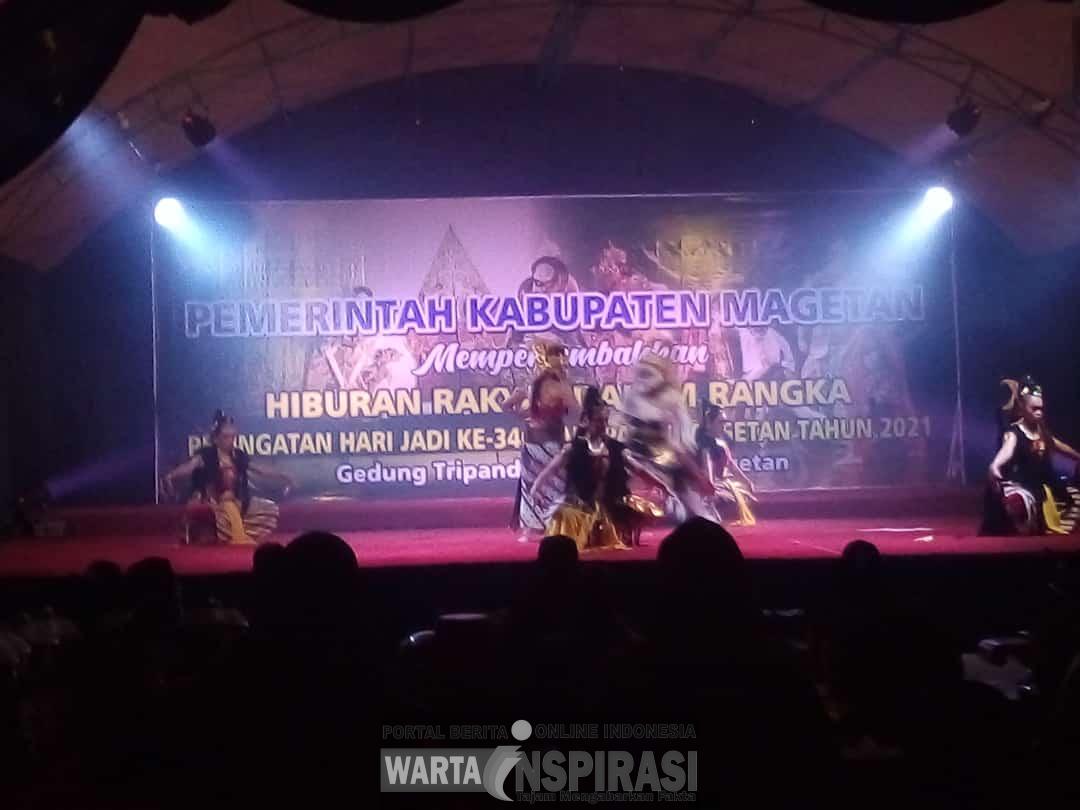 MAGETAN | wartainspirasi.com – Dalam rangka memperingati Hari Ulang Tahun (HUT) Kabupaten Magetan ke-346, Pemkab Magetan gelar Hiburan Rakyat berupa Pagelaran Kesenian Wayang Orang dengan lakon “Puruhita sang Wibisana” secara Virtual dengan tetap dilaksanakan secara Prokes. Bertempat di Gedung Tripandhita, Rabu (13/10/21).