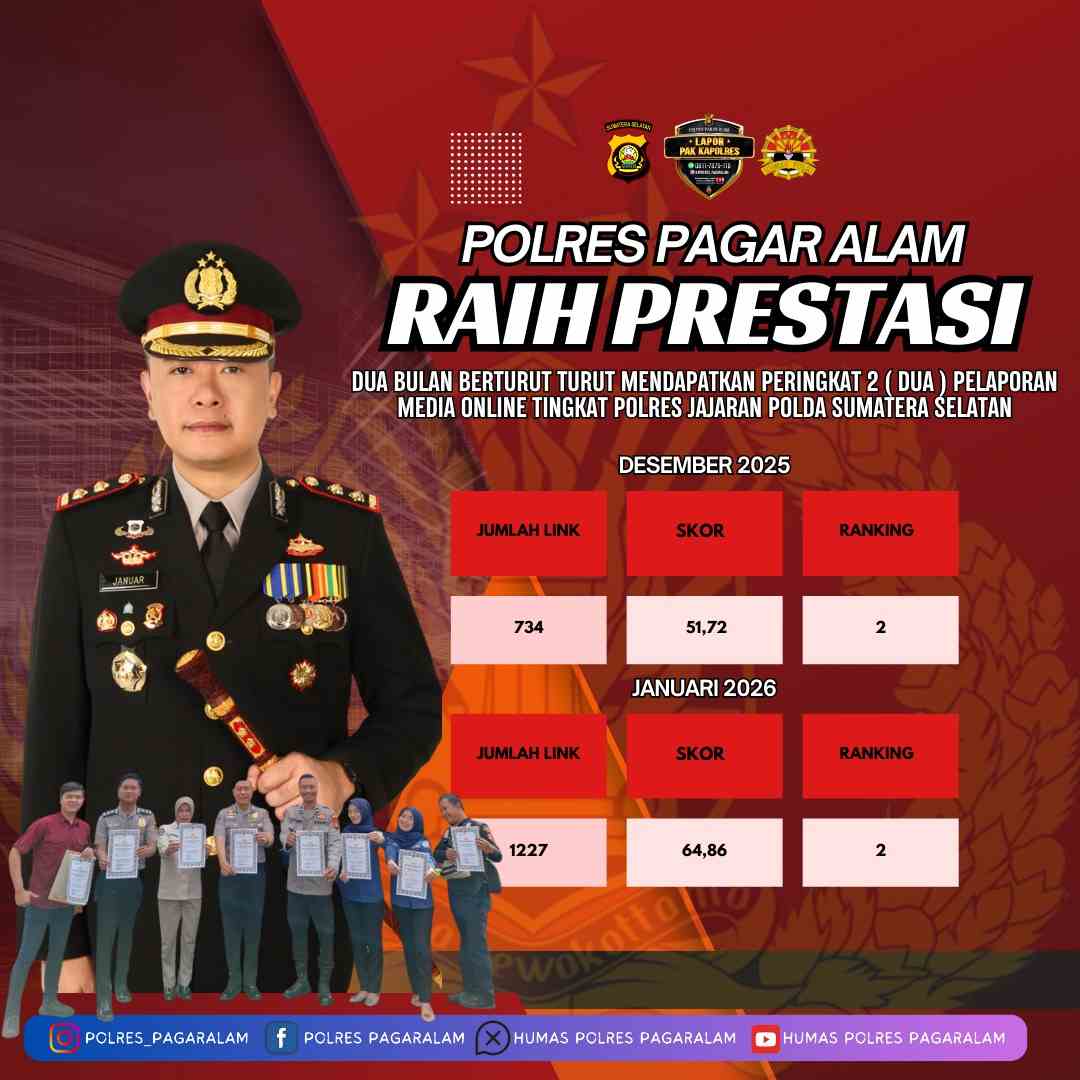 Wartainspirasi.com — Kinerja Polres Pagar Alam kembali menorehkan prestasi membanggakan. Berdasarkan data rekapitulasi keaktifan laporan media online terintegrasi jajaran Polres Polda Sumsel, Polres Pagar Alam berhasil menempati peringkat Kedua berturut – turut dengan skor tertinggi kedua pada bulan Desember 2025 dan bulan Januari 2026