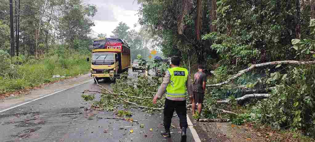 Dijelaskan, pohon tumbang ini diakibatkan adanya angin serta hujan dengan intensitas cukup tinggi, yang membuat pohon roboh dan menutupi sebagian bahu Jalinsum.