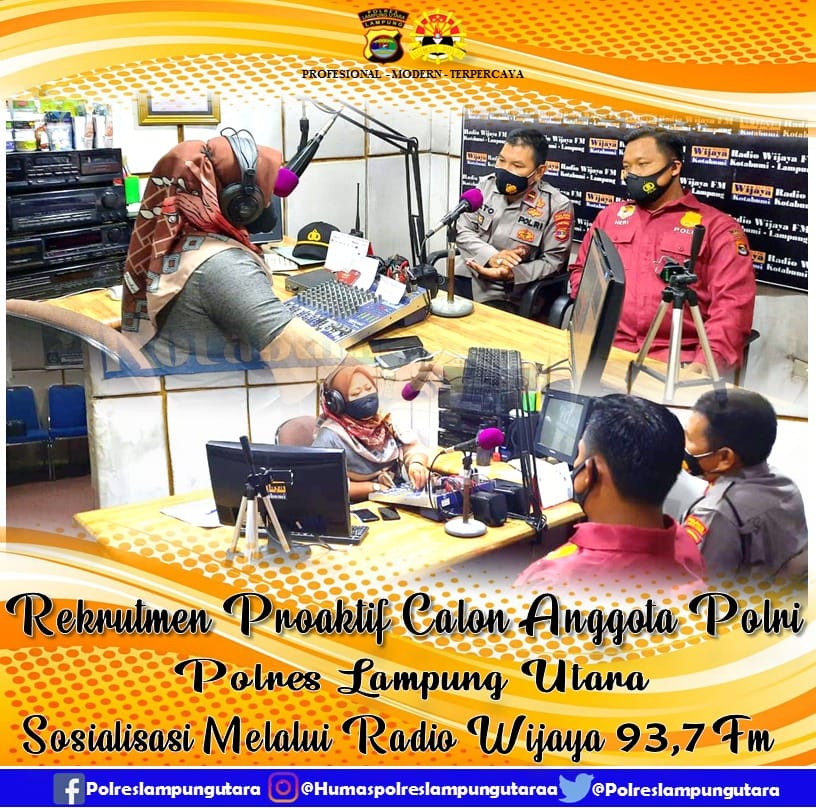 Wartainspirasi.com, Lampung Utara – Dalam rangka menjaring minat para calon anggota Polri TA 2021, Polres Lampung Utara melalui Bagian Sumber Daya (Bag Sumda) melaksanakan sosialisasi Rekrutmen Proaktif Calon Anggota Polri kepada masyarakat melalui radio, Senin (30/11/2020).