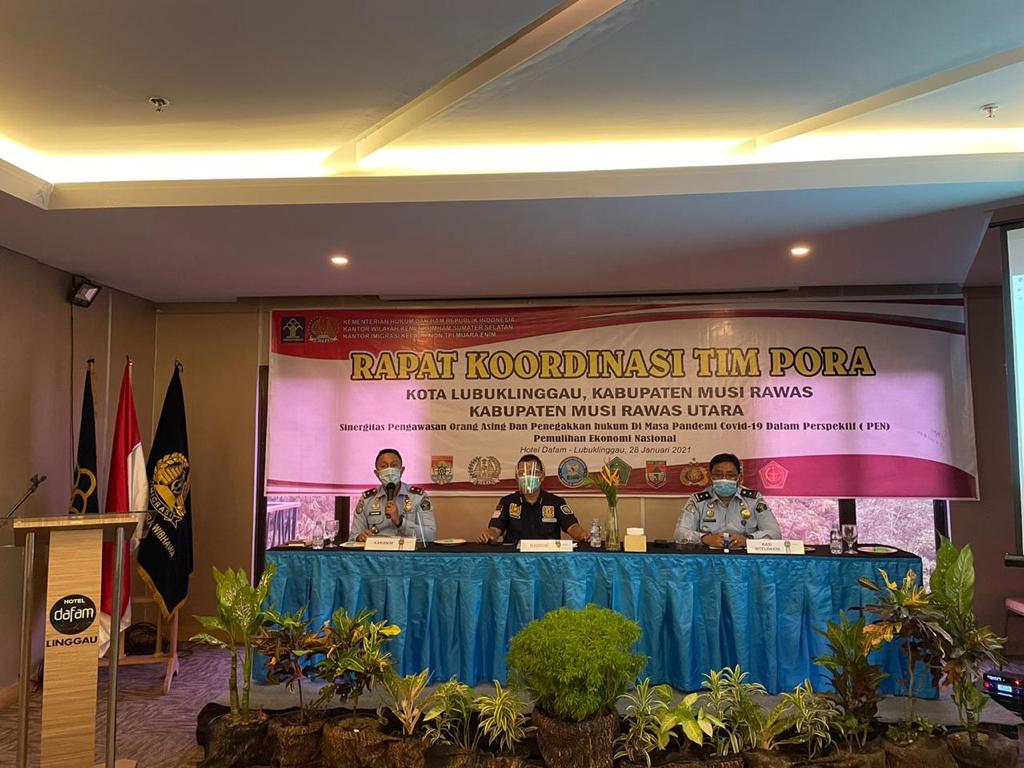 Dalam Rakor TIMPORA tersebut hadir Wakil Wali kota Lubuk Linggau H Sulaiman Kohar, Pemkab Musirawas yang mewakili, Pemkab Muratara yang mewakili, Kanwil Imigrasi diwakili Kadiv Keimigrasian Herdaus SH MH, Kakanim Muara Enim Made Nurhepi Juniartha SH MAP, Kasi Intel Imigrasi Muara Enim Machmudi SE serta tamu undangan lainya.